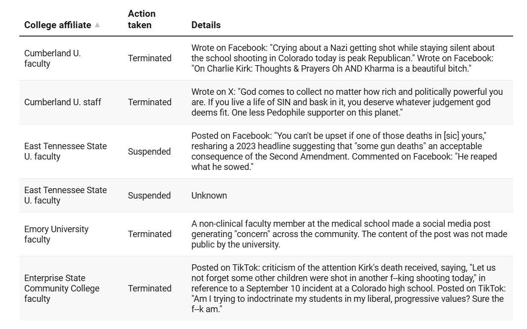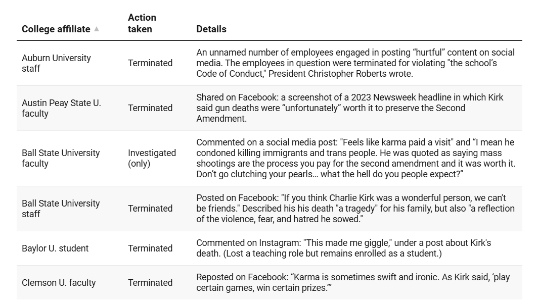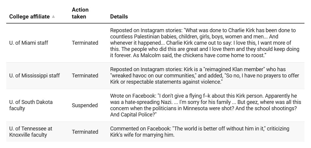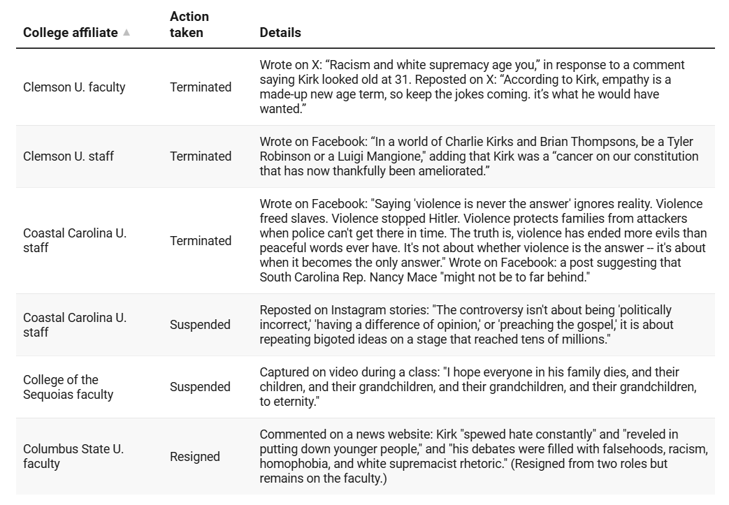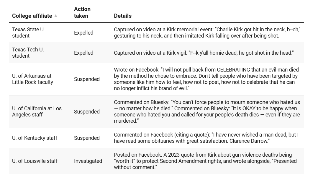 https://www.chronicle.com/article/employees-and-students-at-these-colleges-have-been-punished-for-comments-on-charlie-kirks-death