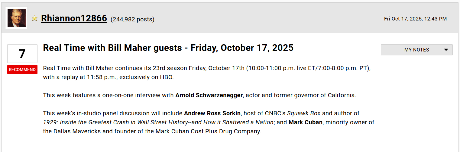 Related: Editorials & Other Articles, Issue Forums, Alliance Forums, Region ForumsReal Whine with Bill Maher guests - Friday, October 17, 2025