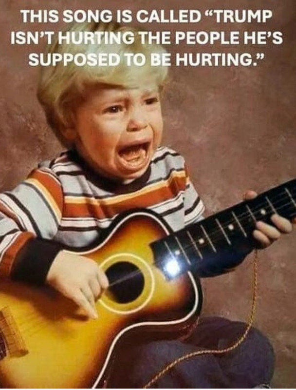 (17,302 posts)all those other people suffering children of immigrants losing their parents, people losing health care; Venezuelans in boats getting blown up without any judge, jury, evidence or conviction of any crime; Hispanic citizens being profiled and detained; hungry poor not getting SNAP to feed their kids; government employees being laid off in large numbers; parents of disabled kids seeing their support systems erased