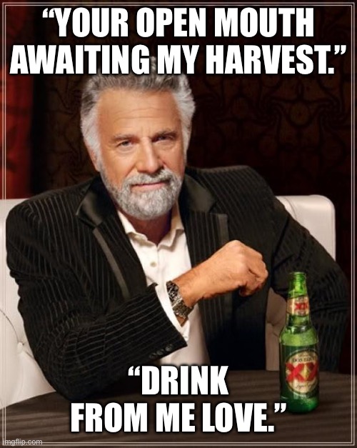 He continued, I mean to squeeze your cheeks to force open your mouth. Ill hold your nose as you look up at me to encourage you to swallow. Dont spill a drop. I am a river You are my canyon. I mean to flow through you. I mean to subdue and tame you. My Love.