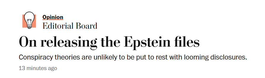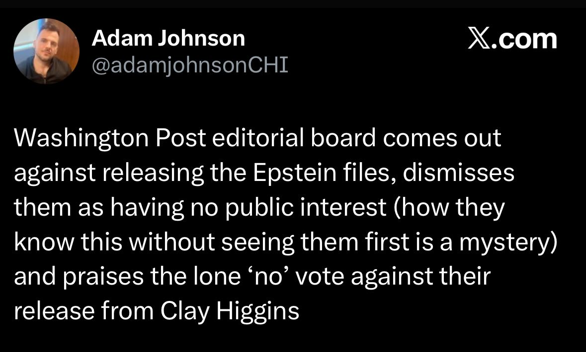 Washington Post editorial board comes out against releasing the Epstein files, dismisses them as having no public interest (how they know this without seeing them first is a mystery) and praises the lone 'no' vote against their release from Clay Higgins