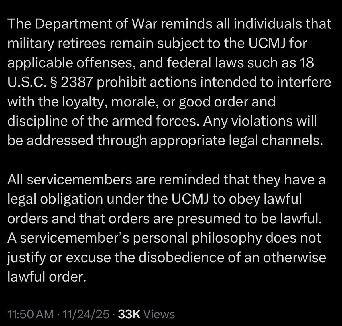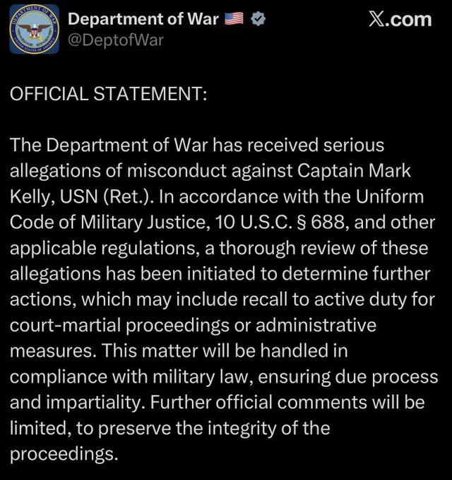 The Department of War has received serious allegations of misconduct against Captain Mark Kelly, USN (Ret.). In accordance with the Uniform Code of Military Justice, 10 U.S.C. § 688, and other applicable regulations, a thorough review of these allegations has been initiated to determine further actions, which may include recall to active duty for court-martial proceedings or administrative measures.
