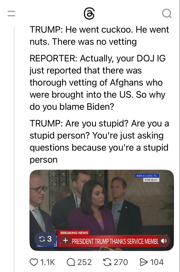 Actually, your DOJ, [inspector general] just reported this year that there was thorough vetting by DHS and by the FBI of these Afghans who were brought into the U.S., so why do you blame the Biden administration for what this man did?