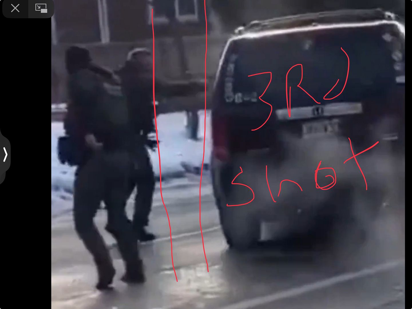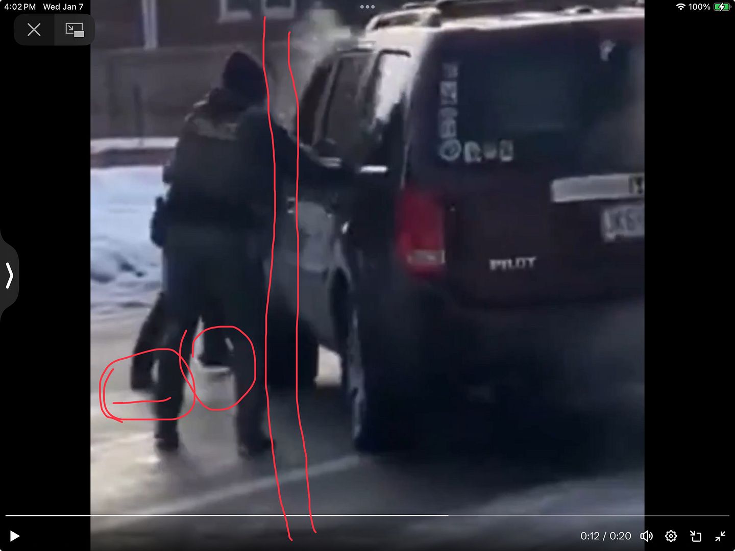 The shooter was at a safe distance in front of the victim's vehicle when the other bullying ICE agent stormed it, pulled on the door handle, and shouted, "Get out of the f****** car!" The victim became rightfully frightened. She backed the car up a bit. I read that, while she was backing up, the forward ICE agent (the killer) drew his sidearm. As the victim drove forward and to the right, the killer fired two rounds straight into the windshield. As the car continued to move forward and to the right, the killer fired the third round through the side window. The image you posted captures possibly a moment between the second and third shot.
