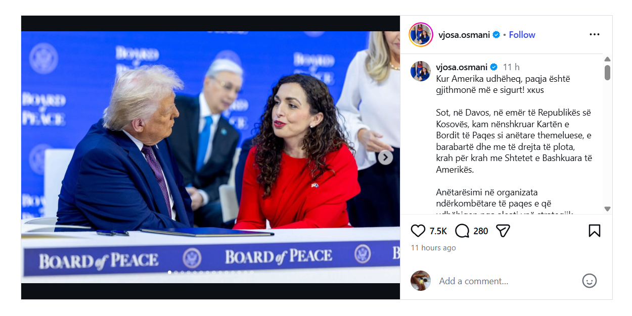 Today, in Davos, on behalf of the Republic of Kosovo, I signed the Charter of the Peace Board as a founding member, equal and with full rights, side by side with the United States of America.