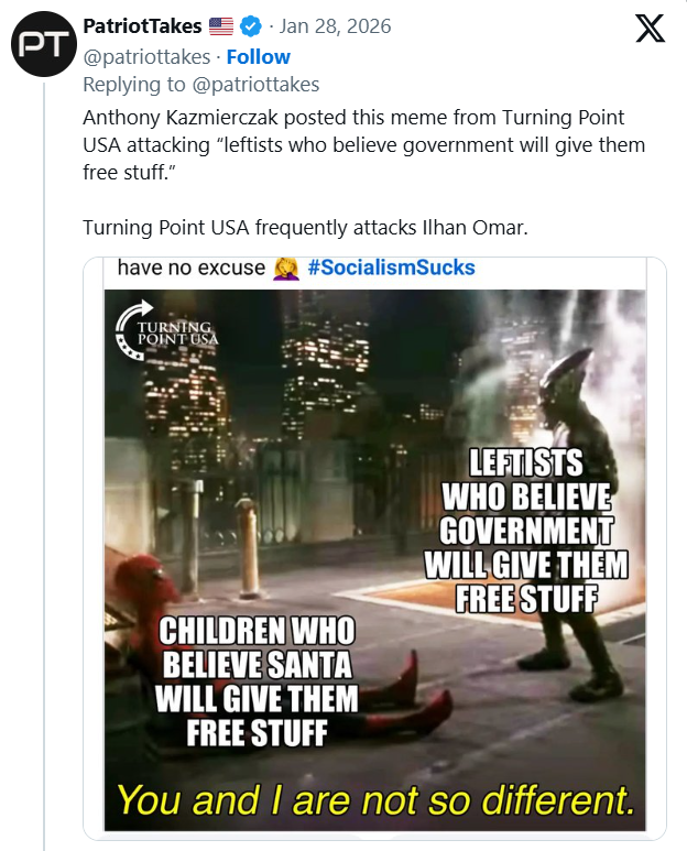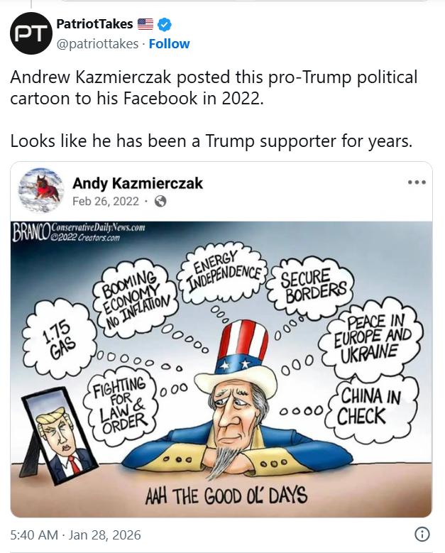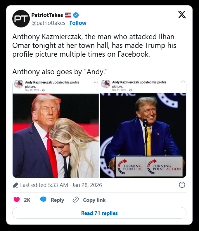 The man who attacked Representative Ilhan Omar by spraying an unknown substance appears to have been a big supporter of Donald Trump and MAGA. Anthony Kazmierczak, 55, followed multiple right-wing accounts on X, including Libs of TikTok, Charlie Kirk, Ben Shapiro, and Tim Pool. On Facebook, Kazmierczak had changed his profile picture to Trump multiple times and regularly criticized Democratic politicians like Joe Biden, Nancy Pelosi, and Minnesota Attorney General Keith Ellison (in addition to his attacks on Omar).
