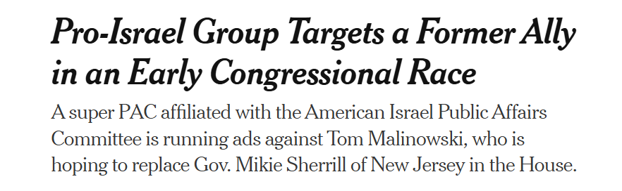 AIPAC Targets a Former Ally, Tom Malinowski (D), in an Early Congressional Race (calling him a 'blank check for Trump') (Original Post)