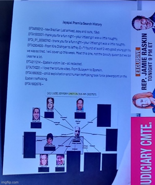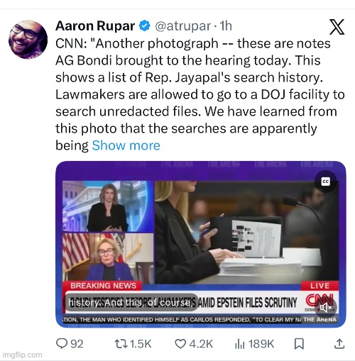 CNN: "Another photograph -- these are notes AG Bondi brought to the hearing today. This shows a list of Rep. Jayapal's search history. Lawmakers are allowed to go to a DOJ facility to search unredacted files. We have learned from this photo that the searches are apparently being tracked and then read by the DOJ."