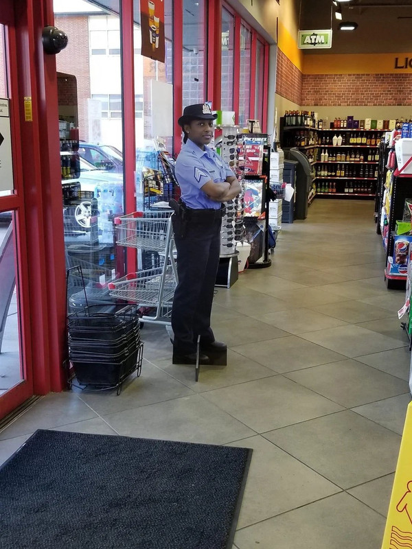 Check out this store guard. Tell me what you see.