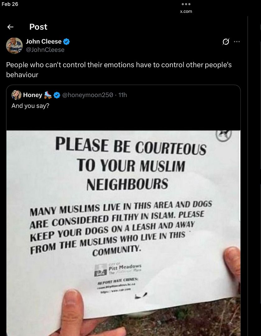 Cleese, 86, made the declaration in a Saturday social media post issued in response to a $750,000 fine being imposed on a former Chilliwack, B.C. school trustee who refuses to believe that gender is a social construct.