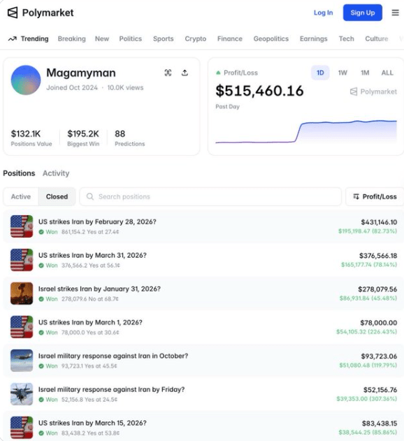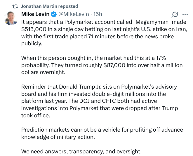 Someone made $515,000 in one day on Polymarket betting on the Iran strikes (Original Post)
