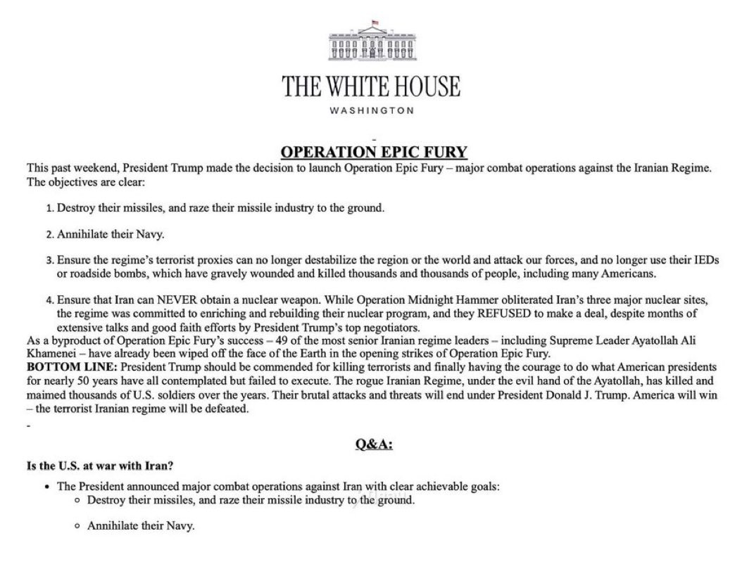 White House talking points for congressional Republicans say we're not at war, we're just in "major combat operations against Iran" lol