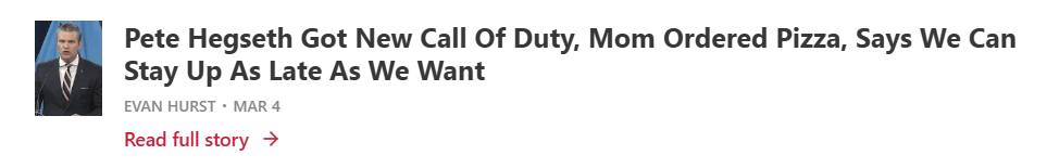Yesterday, during Hegseths masturbating white nationalist teenager press conference, he got his back up at the journalists there, accusing them of reporting on American troop deaths in Iran only to make Donald Trump look bad. As if it doesnt make Trump look bad enough that a week ago, if Trump had just fucked off and played golf instead of starting a pointless war nobody wants, six American troops would be alive today.