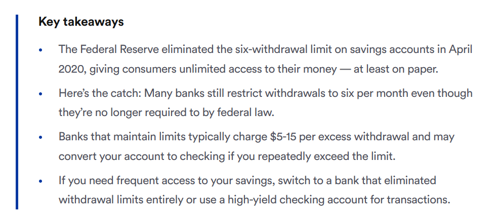Regulation D used to limit savings account withdrawals to six per month. The Federal Reserve scrapped that rule in April 2020. But many banks pretended nothing changed and still enforce the old six-withdrawal limit because they can. Heres what you need to know and how to avoid getting hit with unnecessary fees.