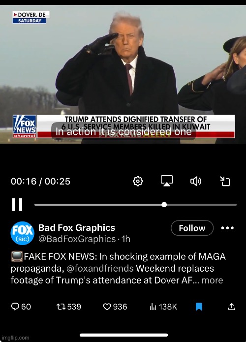 FAKE FOX NEWS: In shocking example of MAGA propaganda, @foxandfriends Weekend replaces footage of Trump's attendance at Dover AFB dignified transfer yesterday with video clip of Trump attending similar transfer on December 17, 2025 all because he wore a baseball cap yesterday