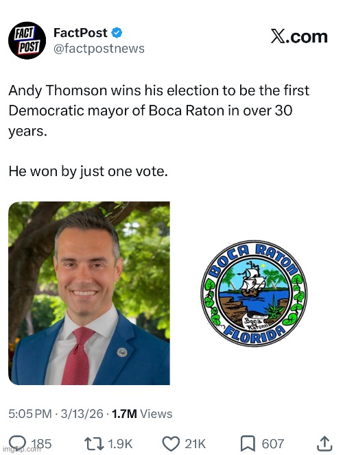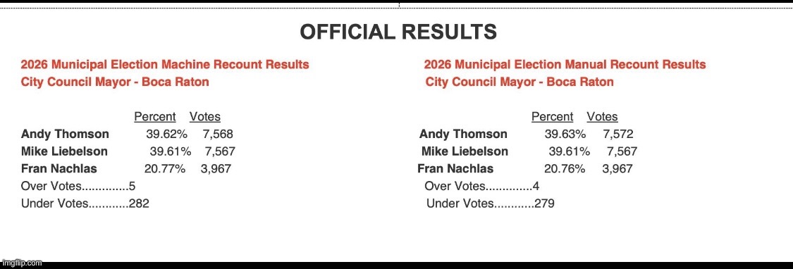 Andy Thomson wins - by 5 votes. 1st Dem Mayor of Boca Raton FL in 30 years. (Original Post)