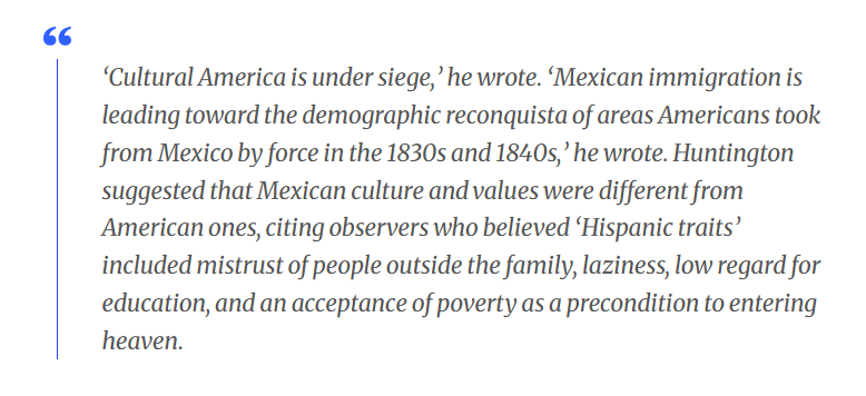 Huntington was a political scientist who served in the White House, but later turned from scholarship to fueling hysteria toward Mexican immigrants. His 1993 Clash of Civilizations essay has helped fuel MAGA worlds anti-immigrant ethos. The New Republic reported on Huntingtons last book before his death, titled Who Are We?: