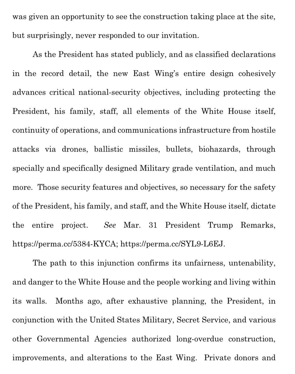 The argument itself was probably written by the lawyers without input from Himself, although that is also ridiculous. Basically, the argument is that the injunction shouldn't have been granted because now there's a big ugly hole on the WH grounds that can't be filled - failing to mention the fact that the big ugly hole is there only because Trump tore down the East Wing without seeking or getting permission.