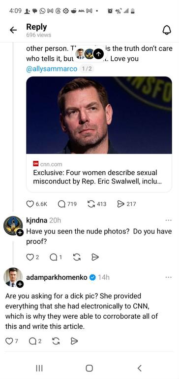 Swalwell has admitted that he's cheated on his wife and he now has 4 women speaking out about being sexually harassed - they are reporting specific details about repeated occasions. The woman who is accusing him of rape has contemporaneous corroboration of the event - she reported sexual abuse to a health care provider within a week of the event.