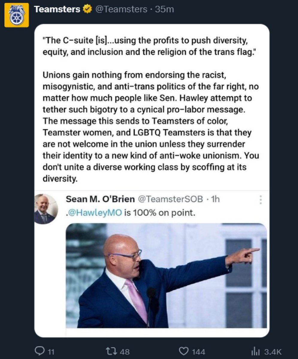 Screenshot from the official teamsters twitter criticizing President OBrien for supporting Hawleys disgusting bigotry