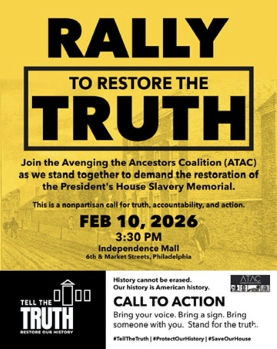👀🗣️🎯💯🔥👊🏾❗️Rally to Restore the Truth! Join Avenging The Ancestors Coalition (ATAC) on Presidents Day (2/16) in Philly to stop racist censorship at Americas first White House where George Washington enslaved Black men, women, and children. Heres more info: