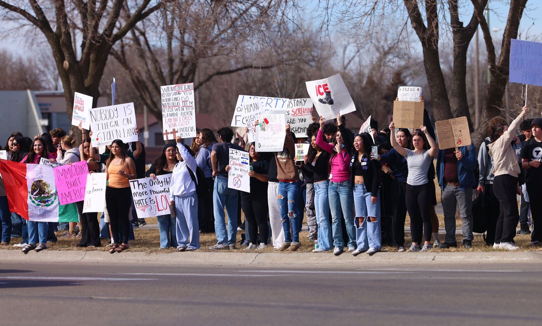 Grand Island Senior High students stage a walkout against ICE on the corner of Capital Avenue and Broadwell on Monday afternoon.