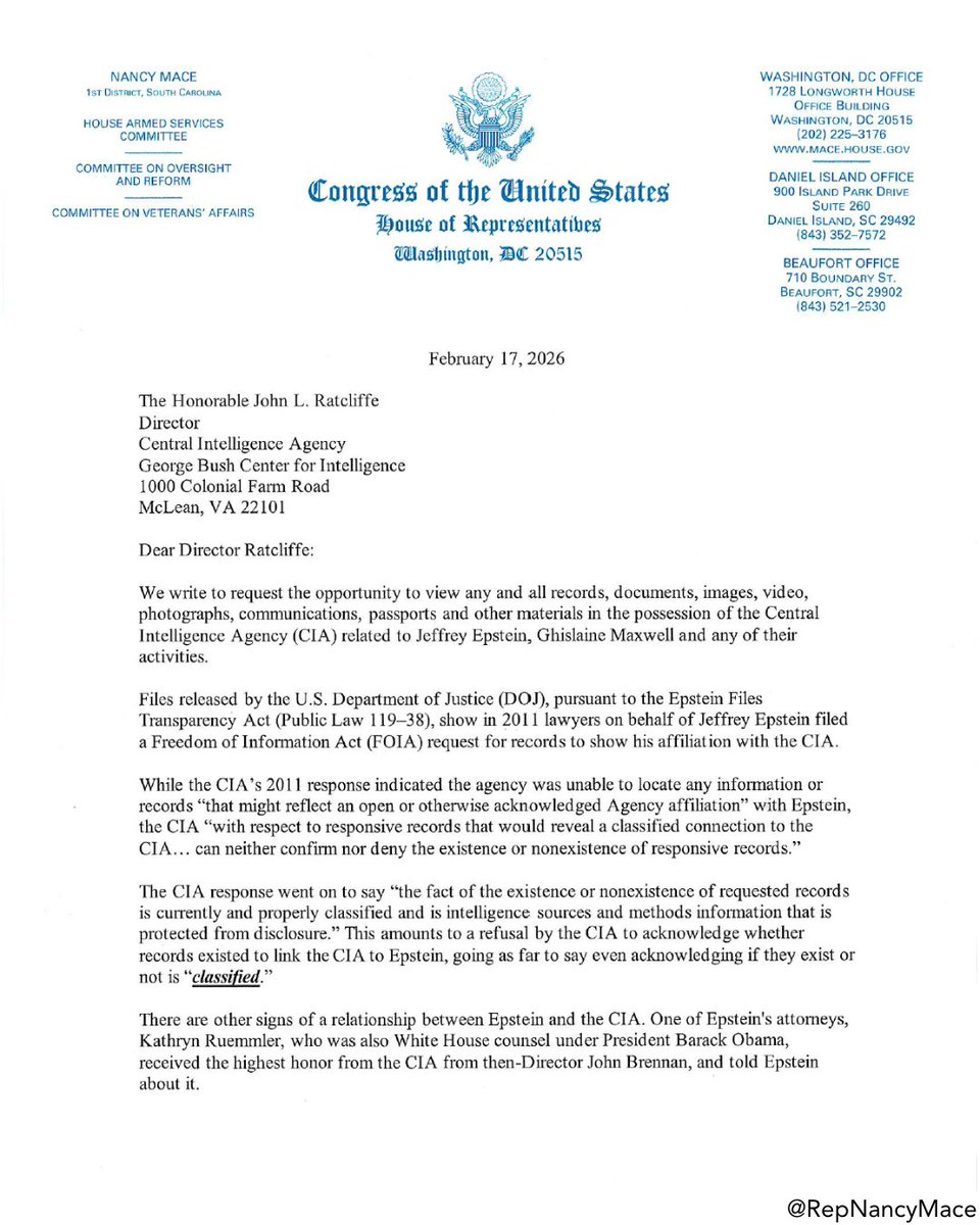 Read more: https://thehill.com/homenews/house/5742394-mace-requests-cia-epstein-files/