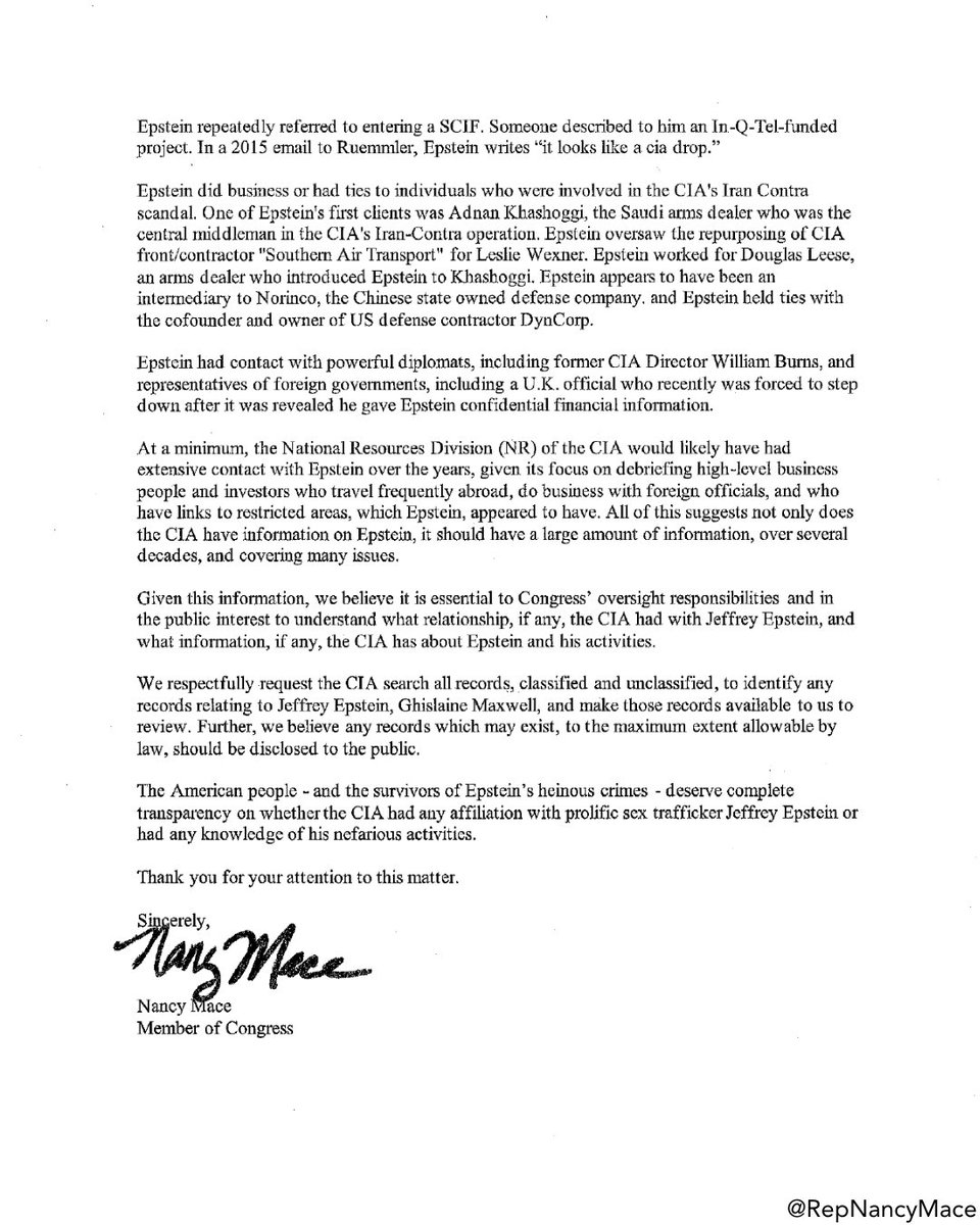His constructing a facade wherein the "Deep State" was "corruptly protecting" Epstein helps with that case, esp. if the CIA is even remotely "involved". Hell, just having a MAGAt like Mace make this request (which I'm sure will be all over Faux and the MAGA podcasters shows shortly) aids in that.