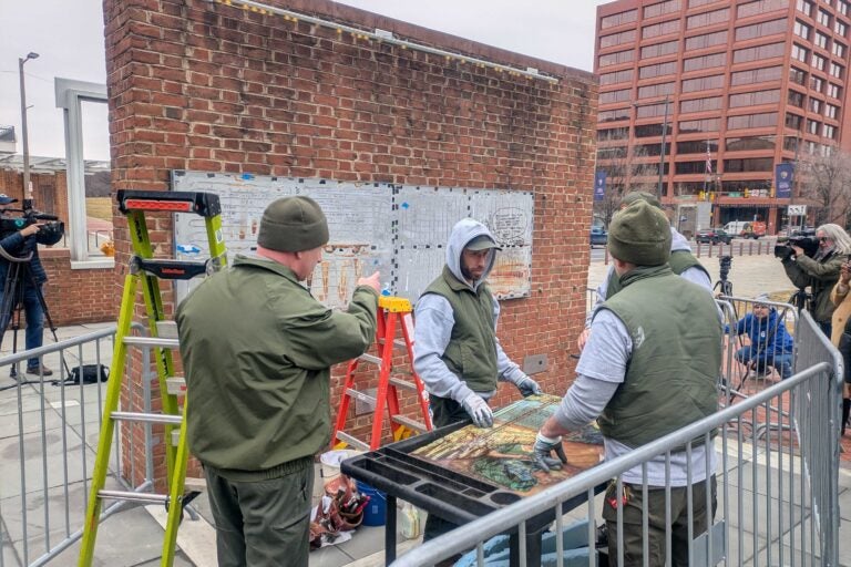 Panels are restored to the slavery exhibits at the President's House Site on Independence Mall on Thursday. (Eric Nixon/WHYY)