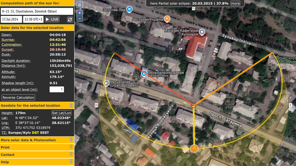 In the case of the photo, finding the physical location was perhaps the easy part. It was in a town called Torez, in the contested Donetsk region of Ukraine. But the amateur investigators were also able to determine the time of day by looking at the shadows. The sun was almost overhead, just as it was at about 12:30 on the day of the attack.