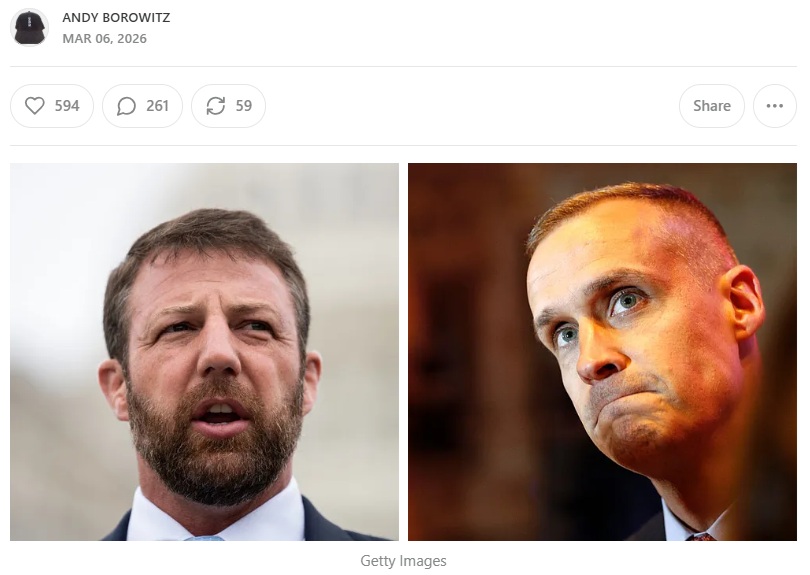 WASHINGTON (The Borowitz Report)—Since being nominated to replace Kristi Noem as head of DHS on Thursday, Senator Markwayne Mullin has suddenly found himself romantically linked to her former chief of staff, Corey Lewandowski.