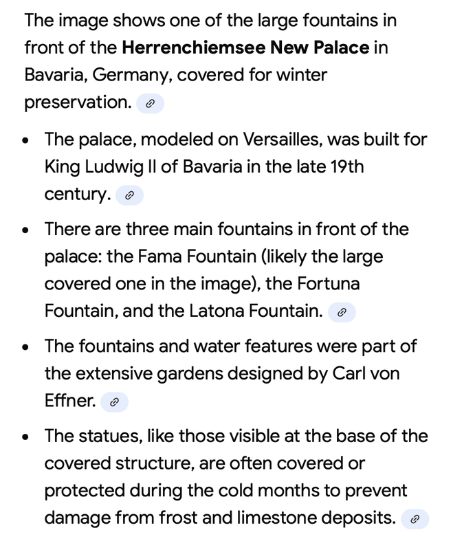 Yours was the first visual image shown. I clicked on the covered fountain and your entire Herreninsel, Chiemsee, post came up.