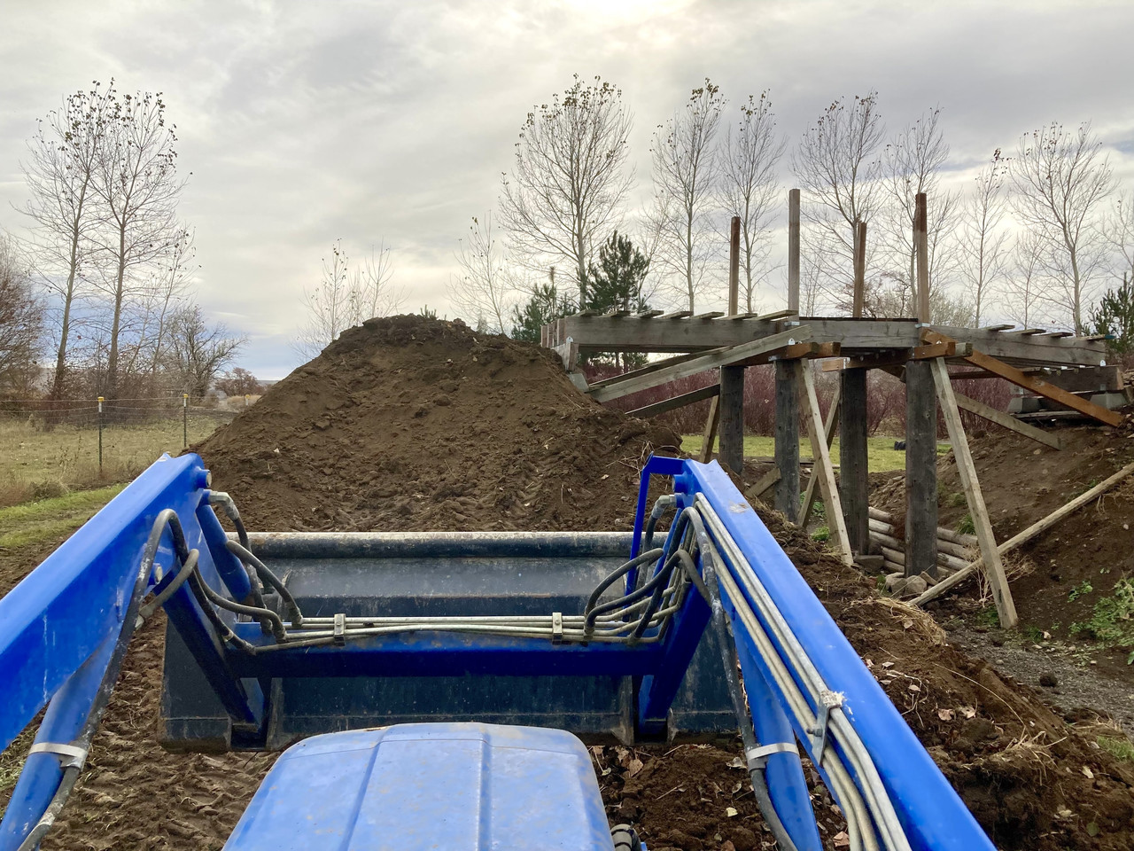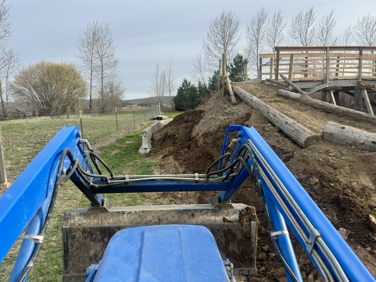 Laurie used her New Holland's bucket loader to dig and move dirt.