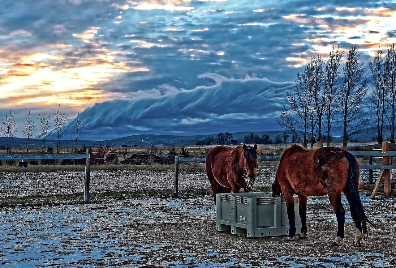 One winter's morning, the wind was fierce, blowing COLD, driving the clouds fast and hard. The scene was wild! Wind was so intense I had to lean into it to stay on my feet. Dumped hay in the bin, took a few pictures and got the heck out of there.