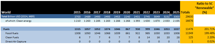 For convenience, I have downloaded the file, and added calculations, comparing the costs of every form of energy, between 2015-2025 to expenditures on so called "renewable energy," which the tables reproduced above demonstrate are trivial, to the point of useless, forms of energy, solar and wind combined, producing just 18 EJ out of 654 EJ consumed in 2024.