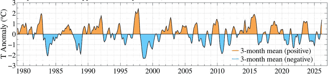 Fig. 1. Equatorial upper ocean (300 m) heat anomaly (°C) at longitudes 180-100W. This is the 3-month running-mean except March 2026, which is a 1-month value.