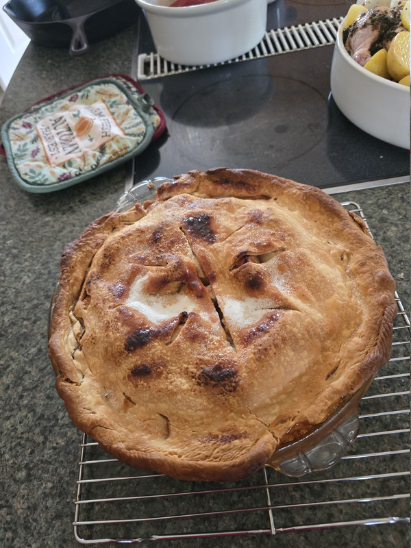 I cooked a pie and cornish hen. Hen about to go in the oven. Pie just came out. She did the scalloped tomatoes and stuffing ( we are not putting it into the hens, she just likes to eat it separately).