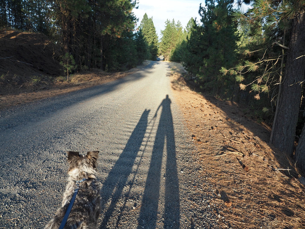 Shadow and dad walking down the hill to get the mail.