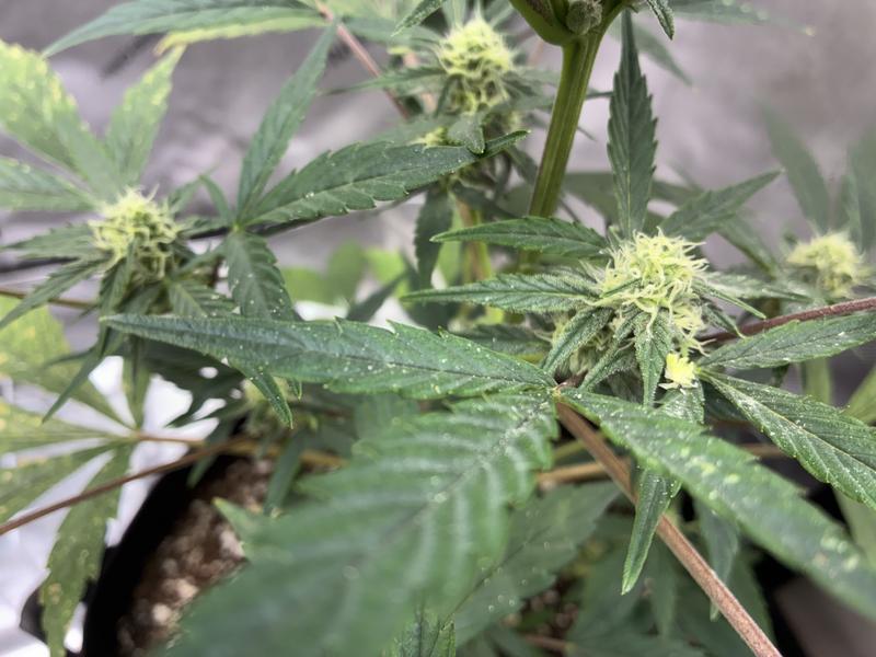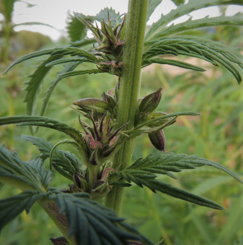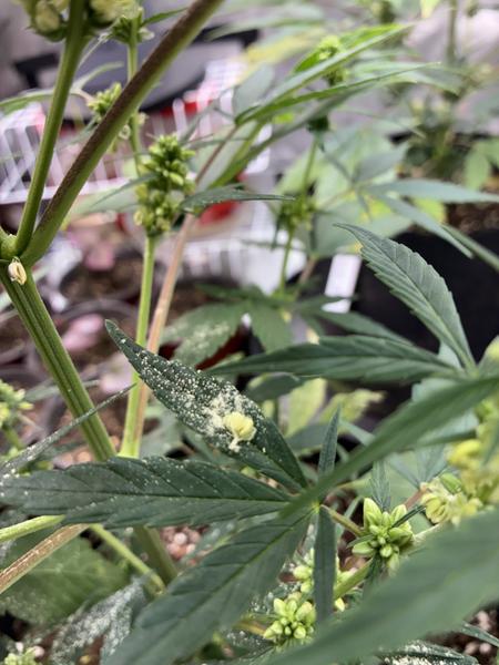 Took this after a week of pulling all the makes from 7 acres only to come out every day and find more males throwing pollen around! And when I went out to inspect, this is what I found. A clearly marked female plant had grown her own pollen pods right over the buds.