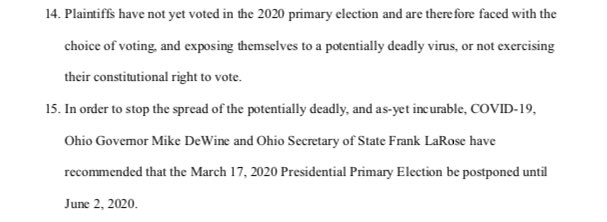 (7,123 posts)DeWine stated he does not have the authority to stop the election so he wants someone to file a suit (which he supports) to delay the election. Tis a bit convenient, given the fact that he has been getting a lot of calls and knows delaying the election makes sense politically and medically given the social distancing restrictions enacted. He has done a good job on this issue, but nevertheless I find it ironic.