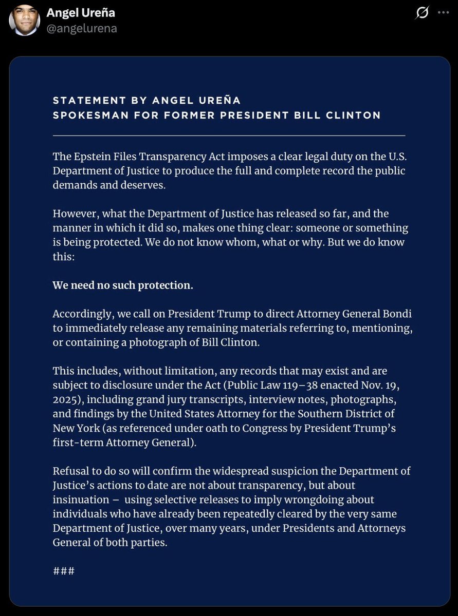 Former President Bill Clinton is demanding full transparency from the Epstein files and accuses trump of coverup